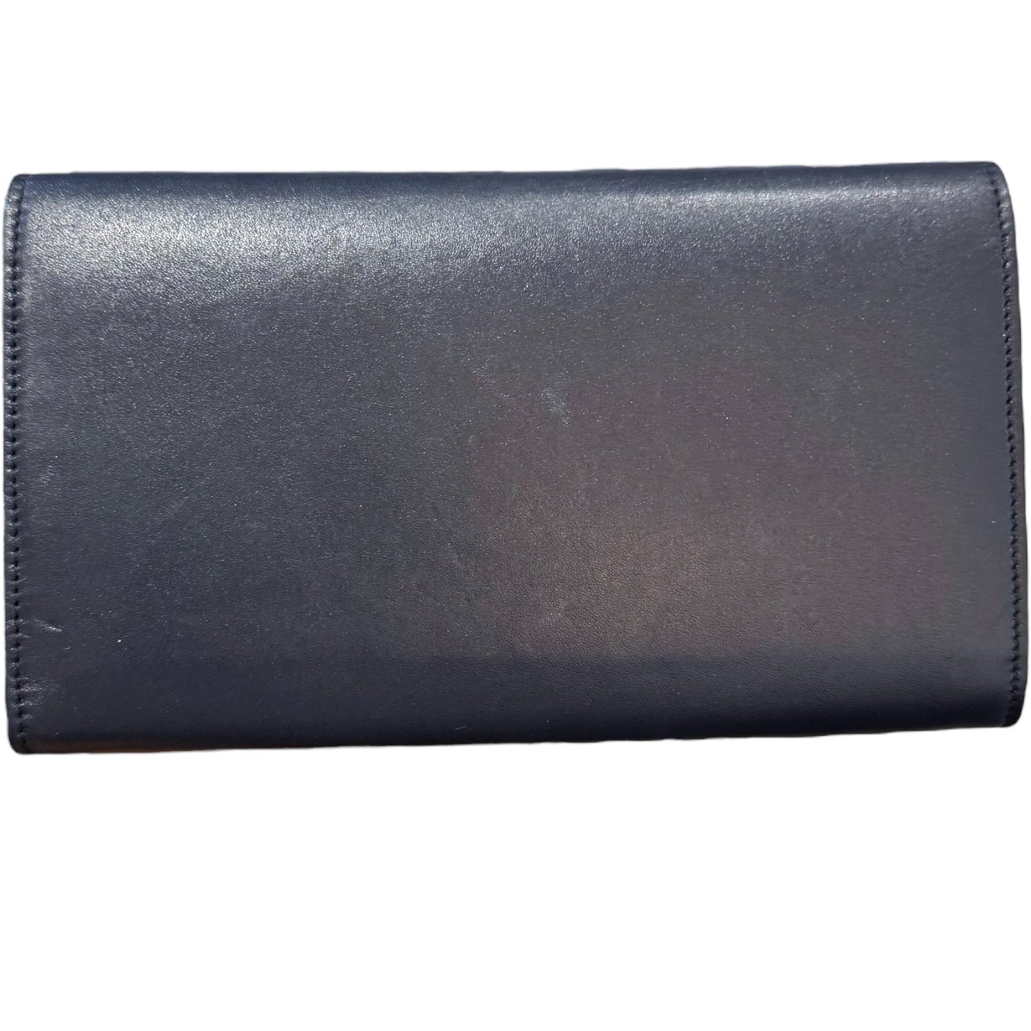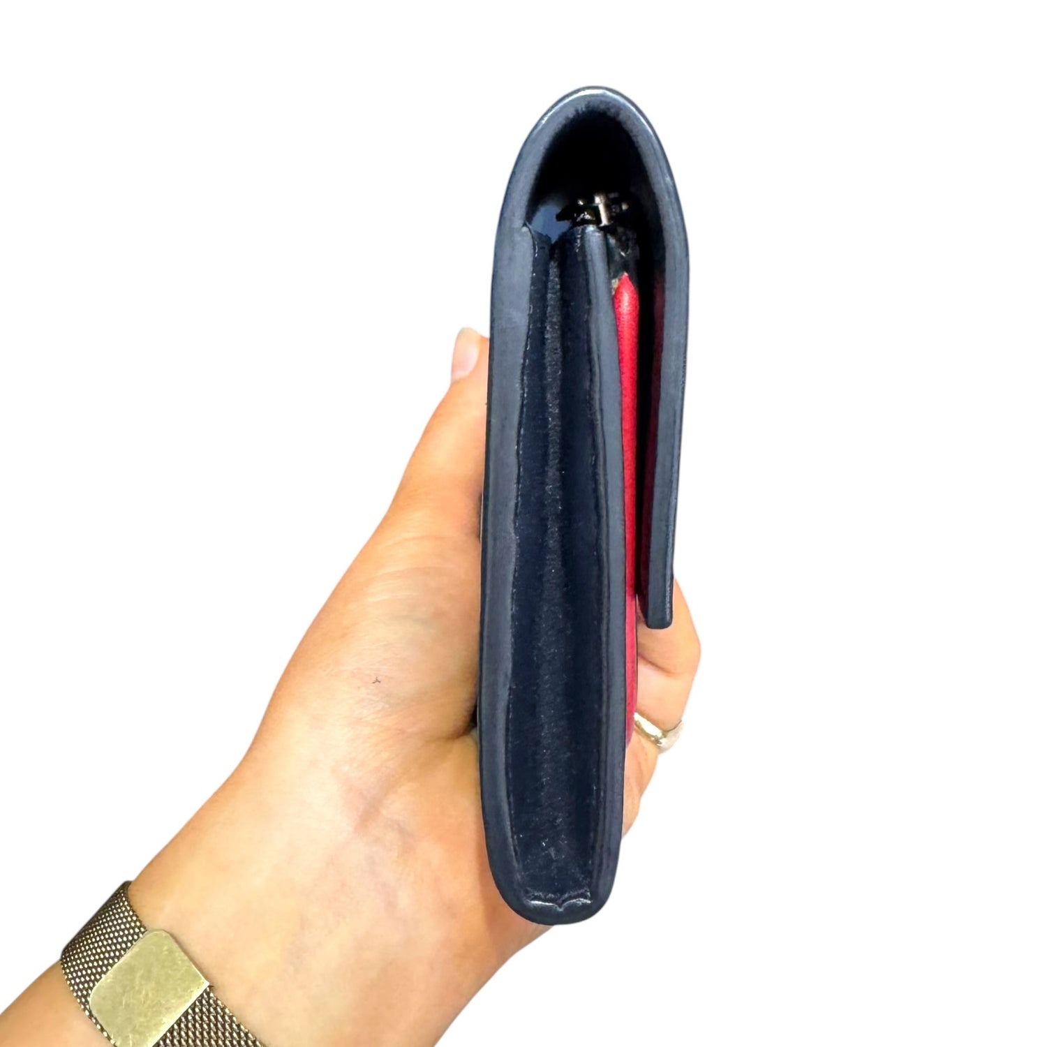 This chic clutch wallet is crafted of lovely smooth calfskin leather in navy with red leather trim. The wallet has a facing flap with a snap and opens to a compact partitioned red leather interior with two panels card slots, bill folds, and a zipper compartment.