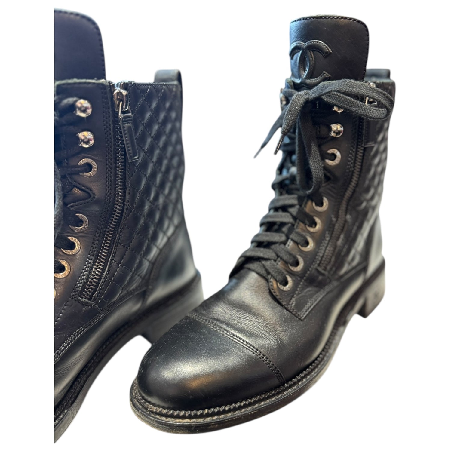 Chanel Black Quilted Leather Lace Up CC Ankle Boots