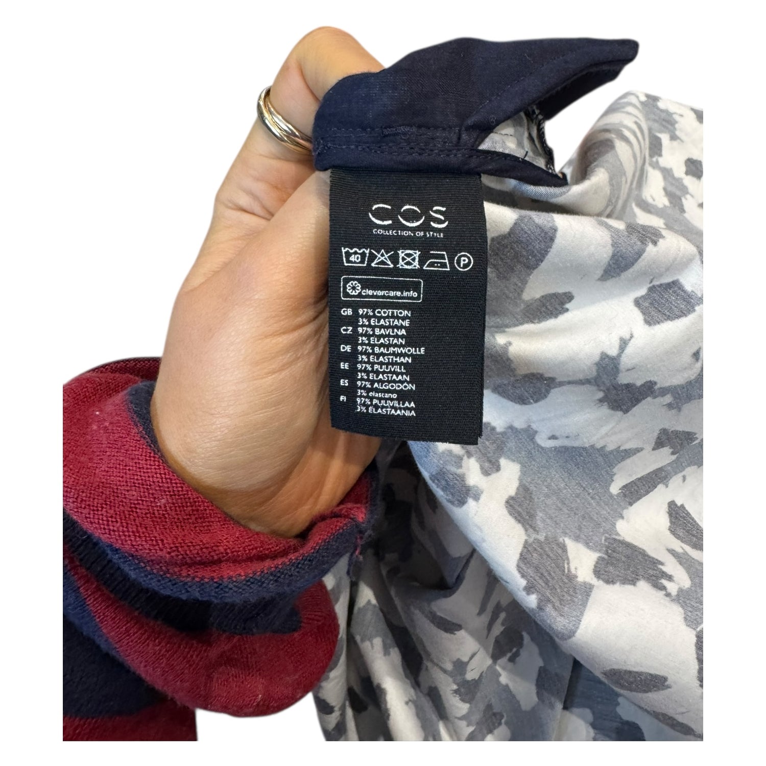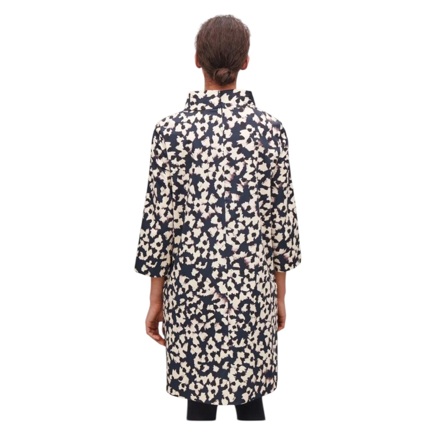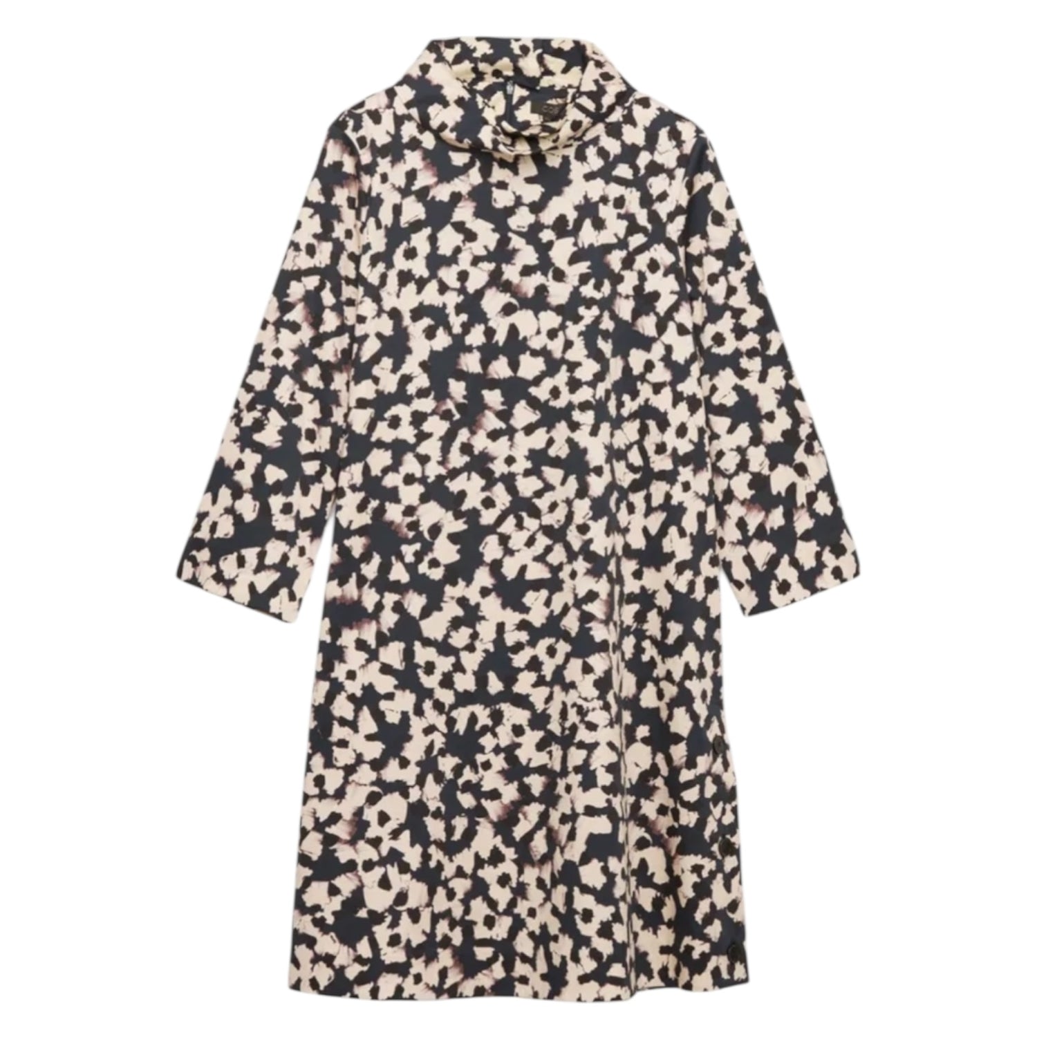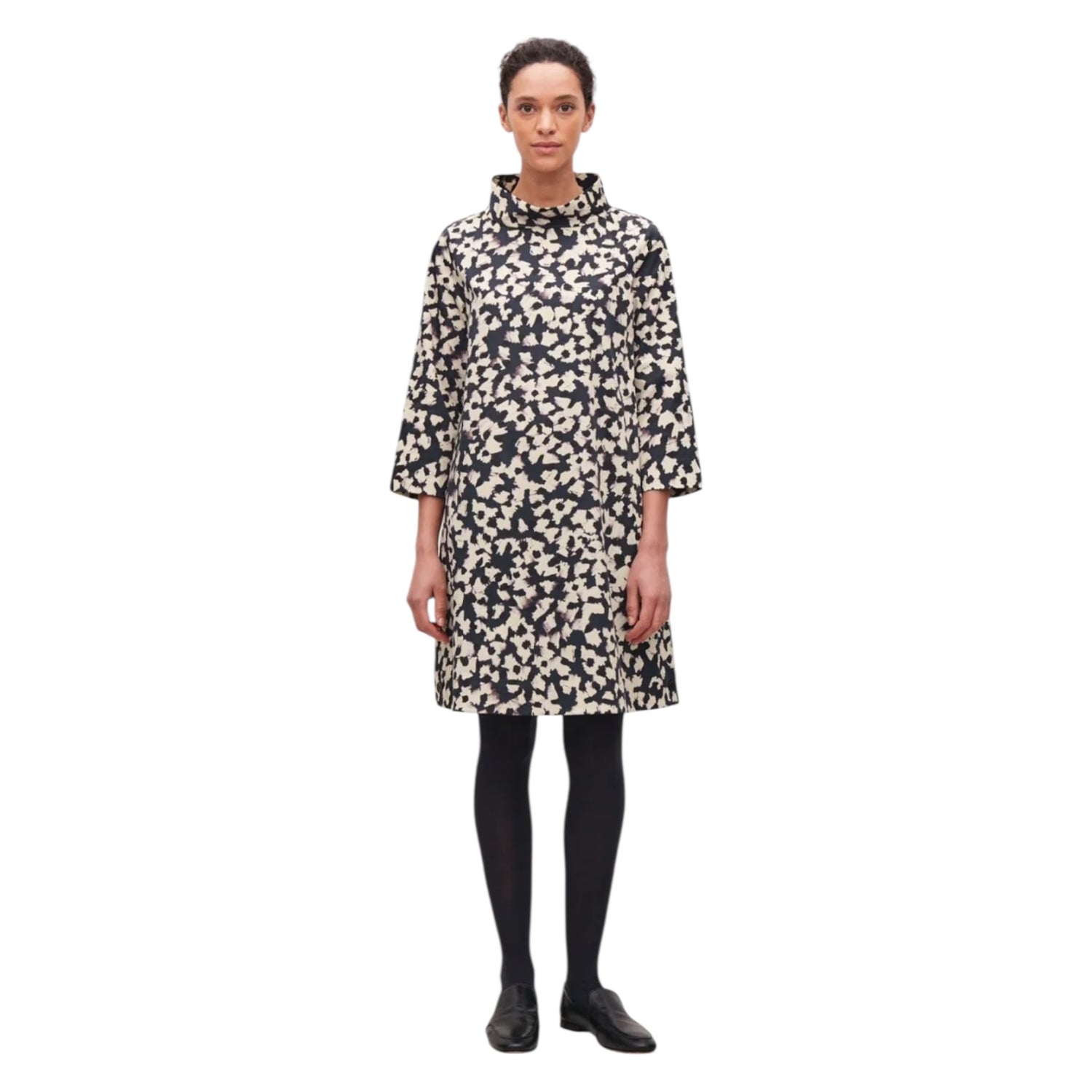 Printed with an abstract pattern, this ¾-sleeved dress is made from a smooth cotton blend with a stand-up collar. An A-line shape, it has a discreet zip fastening at the back, hidden side pockets and buttoned slits at the side.
