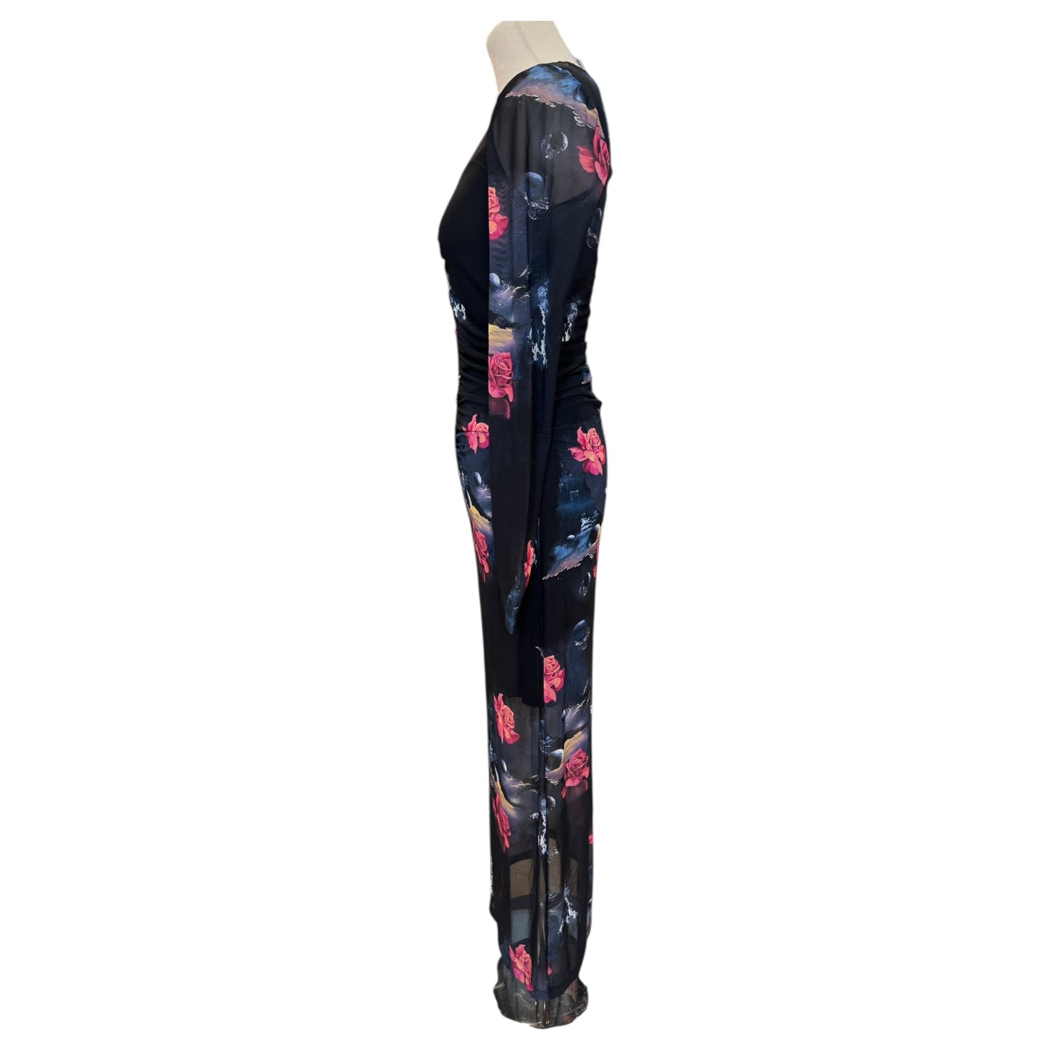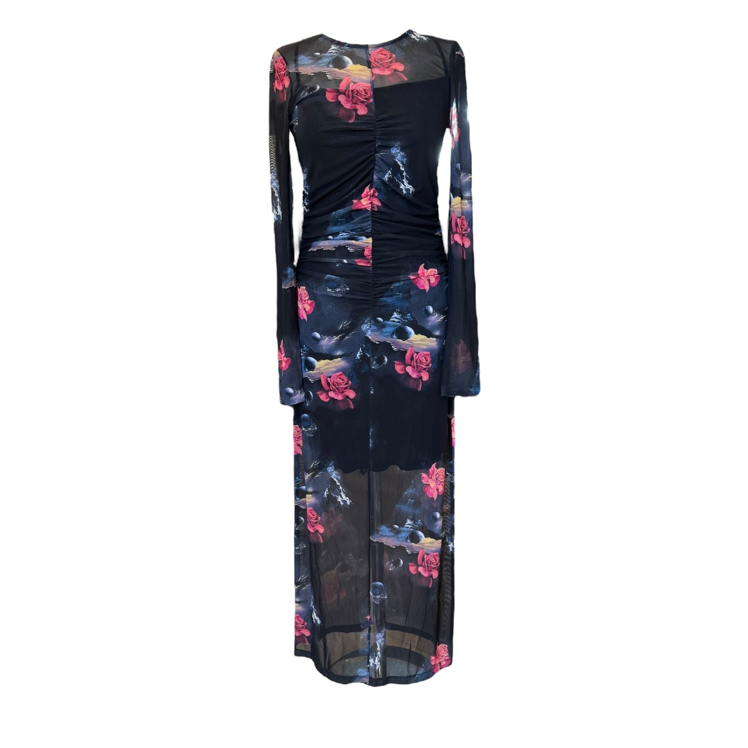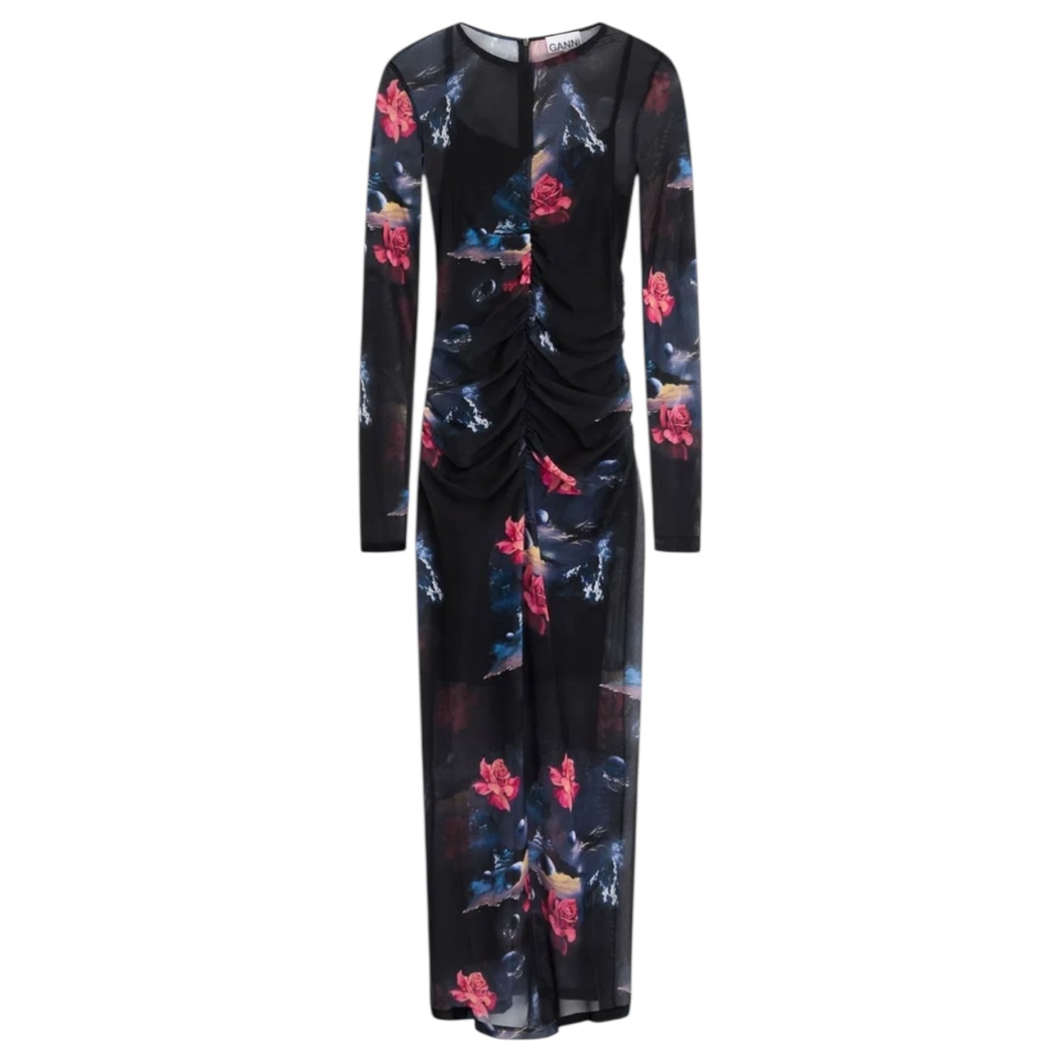 Ganni Black Ruched Floral Mesh Midi Dress - 8/10