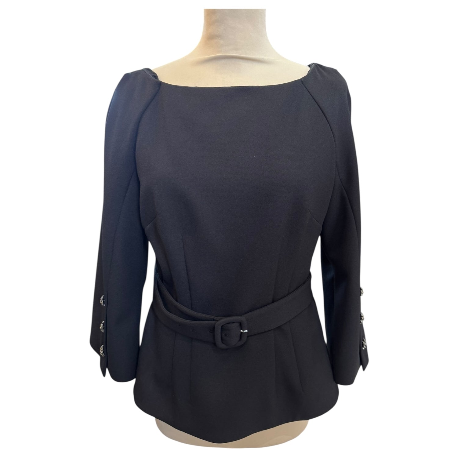 Glamorous blouse with an extravagant cut. The blouse has slightly flared sleeves decorated with sparkling glitter buttons. The waist is given a feminine accent with a fabric-covered belt. It is finished with an invisible zip at the back.
