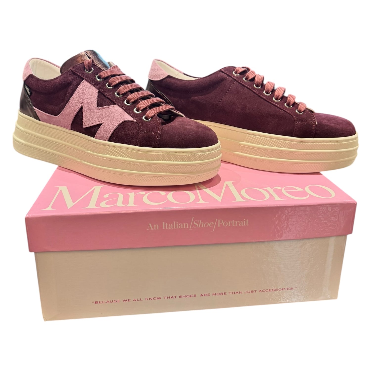 BRAND NEW IN BOX Marco Moreo Madonna Burgundy and Pink Platform Trainers