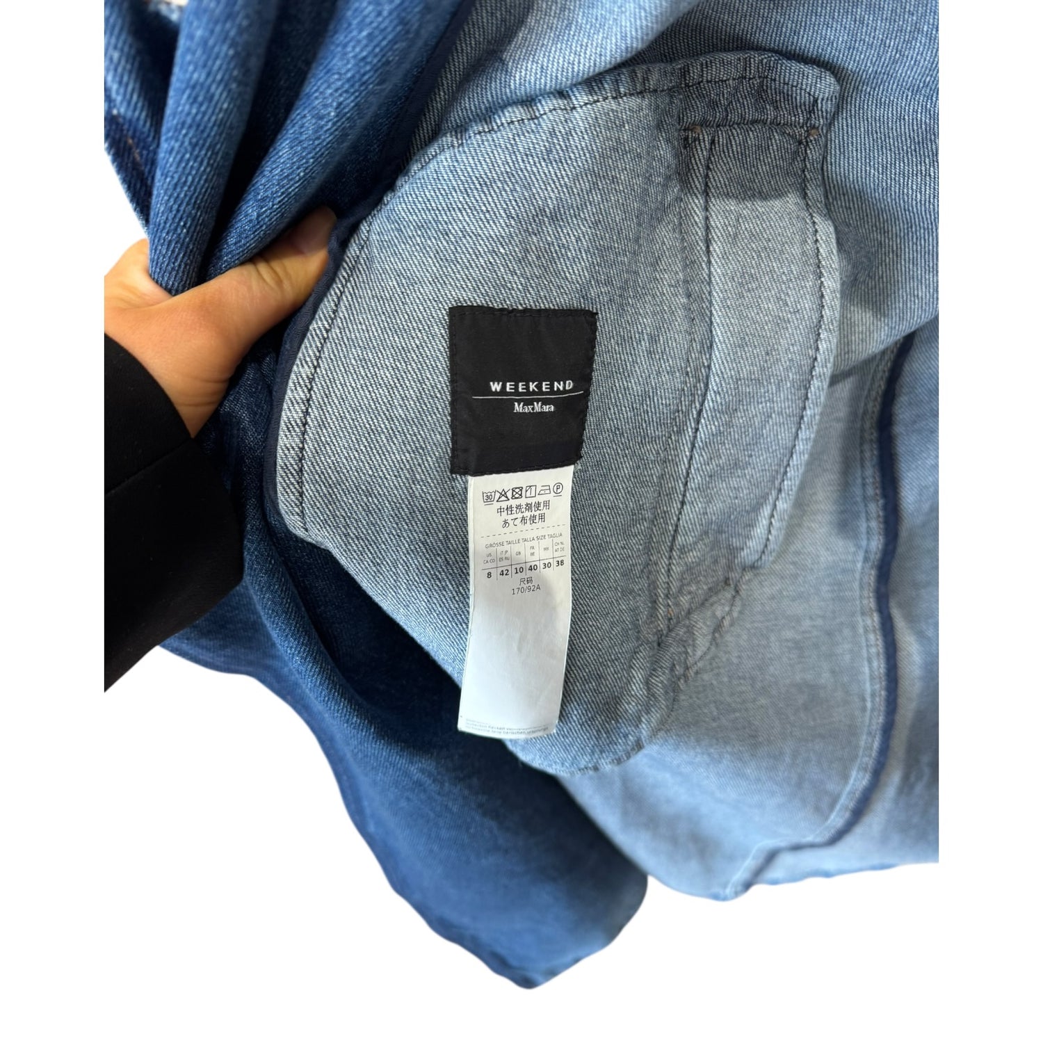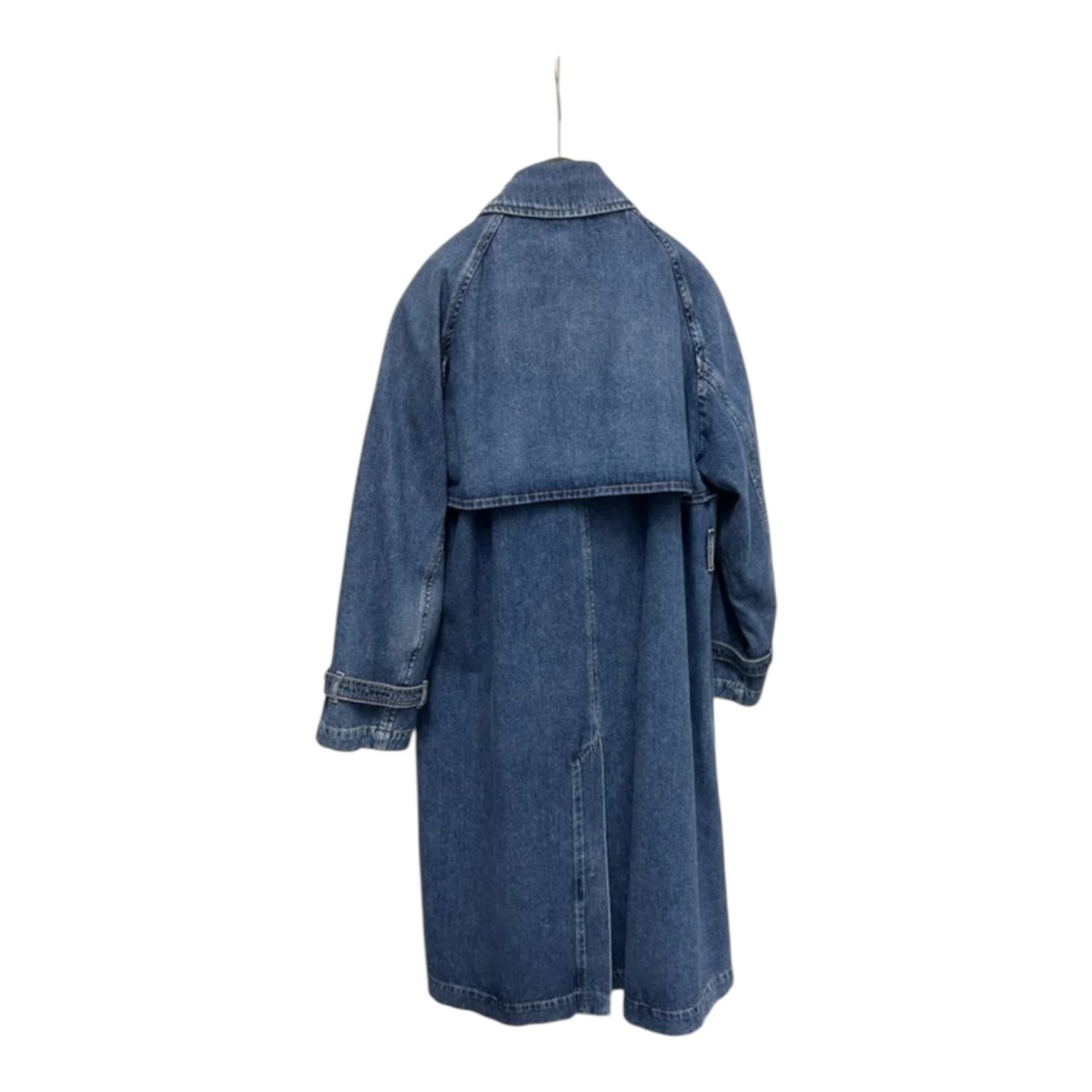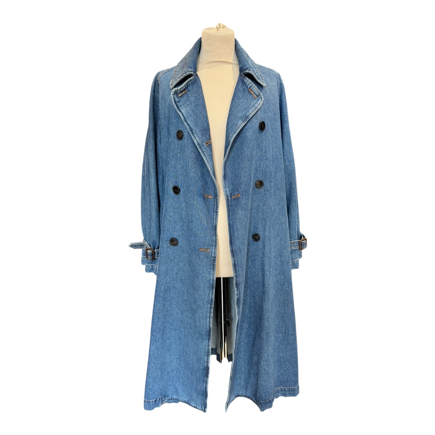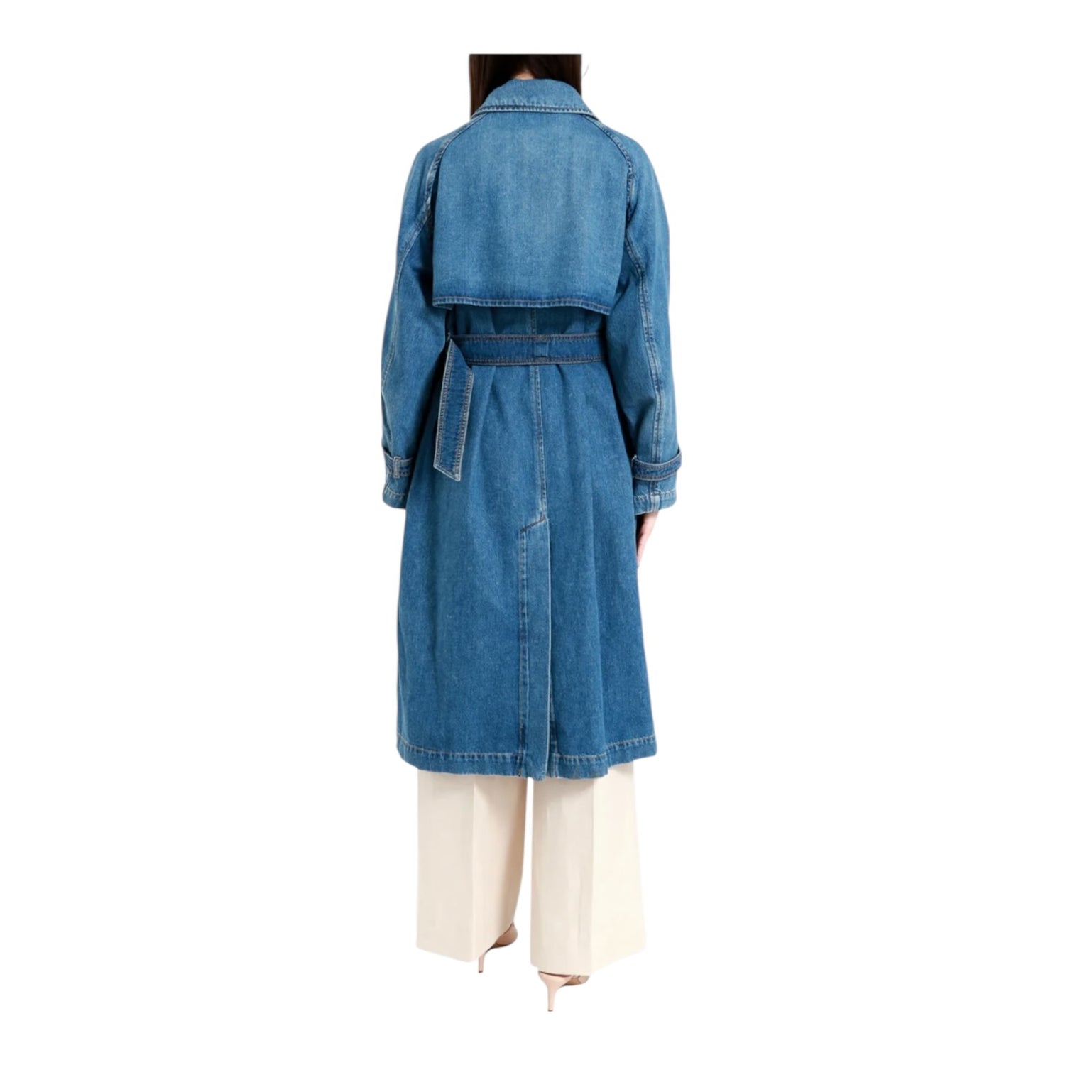 Long trench coat in pure cotton denim that has been garment dyed to create a sophisticated look that accentuates the classic details: pointed collar, raglan sleeves with cuff tabs, a detached yoke at the back and welt pockets. The traditional double breasted horn effect button fastening has been embellished by a matching belt, perfect for emphasising the silhouette. The partially lined model features the Weekend Max Mara logo printed on the yoke lining. This garment is made with natural fibres grown according to organic farming principles. Traditional immersion washing was replaced by Nano Bubble technology, a special atomisation process which significantly reduces consumption of water resources.