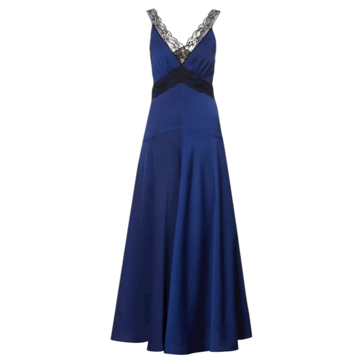 Me + Em Blue and Black Lace Trim Flared Skirt Satin Maxi Dress