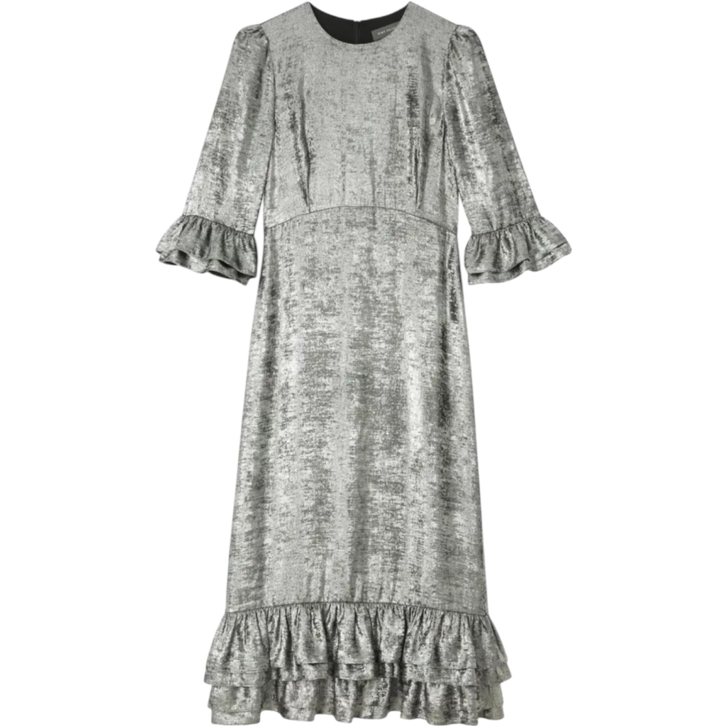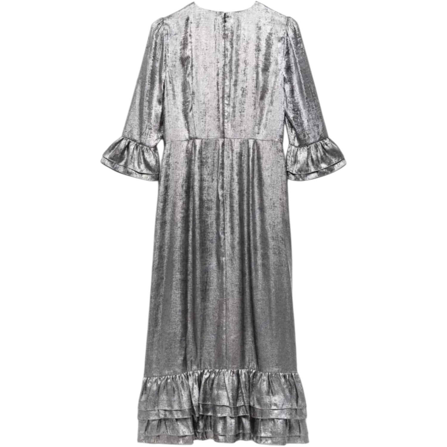 A metallic tone, midi silhouette, crew neckline, puff shoulders, 3/4 ruffle sleeves, layered ruffle hemline with a zip fastening through the back.