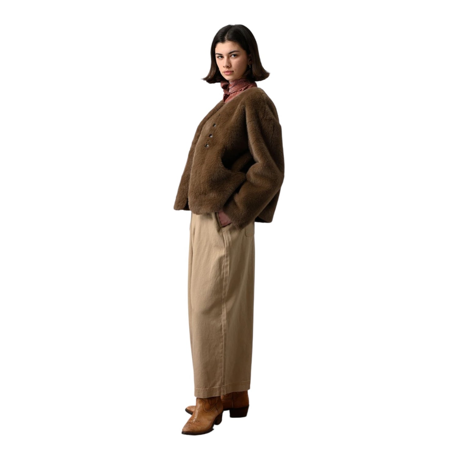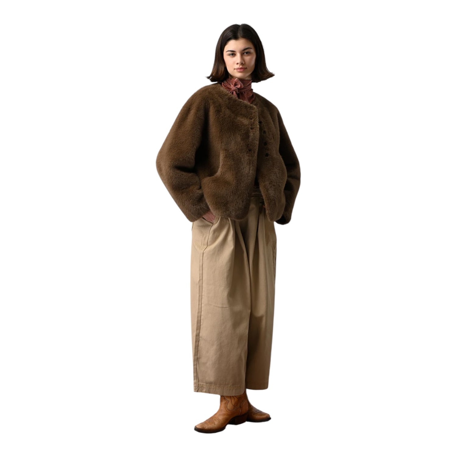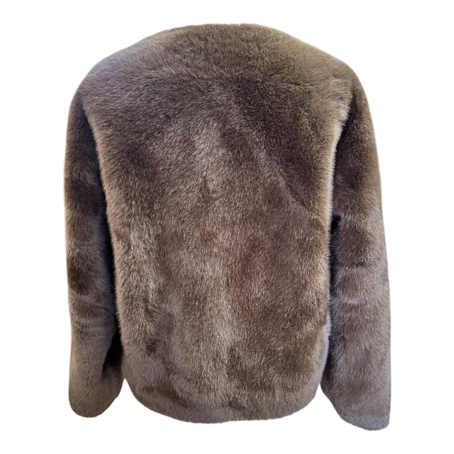 Short faux fur jacket. A soft and refined style with an elegant round neck. Its short cut gives it a modern look, easily paired with an urban or more formal look.