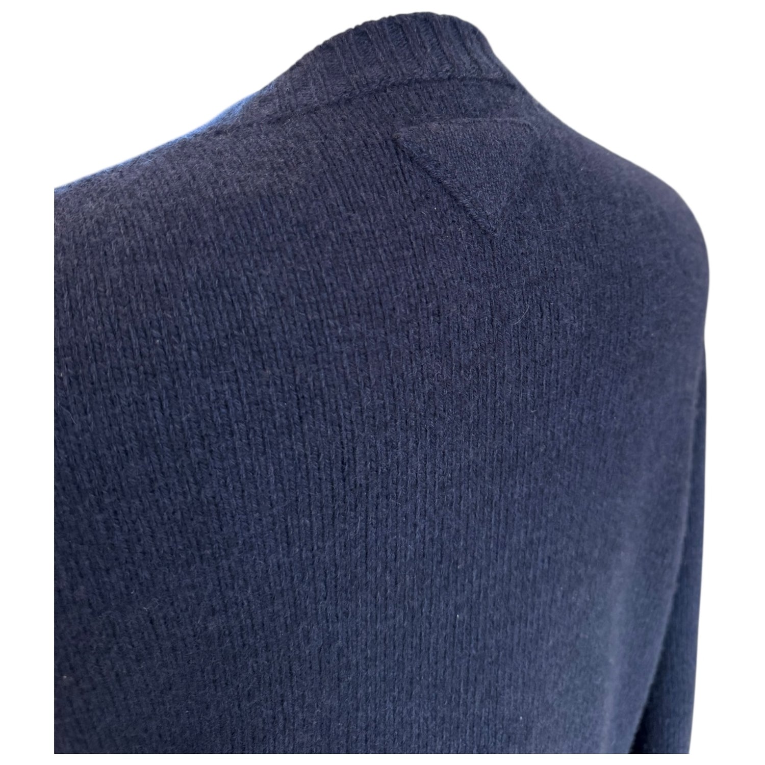 Prada Navy Longline 70% Wool and 30% Cashmere Cardigan with Triangle Accent to Nape of Neck
