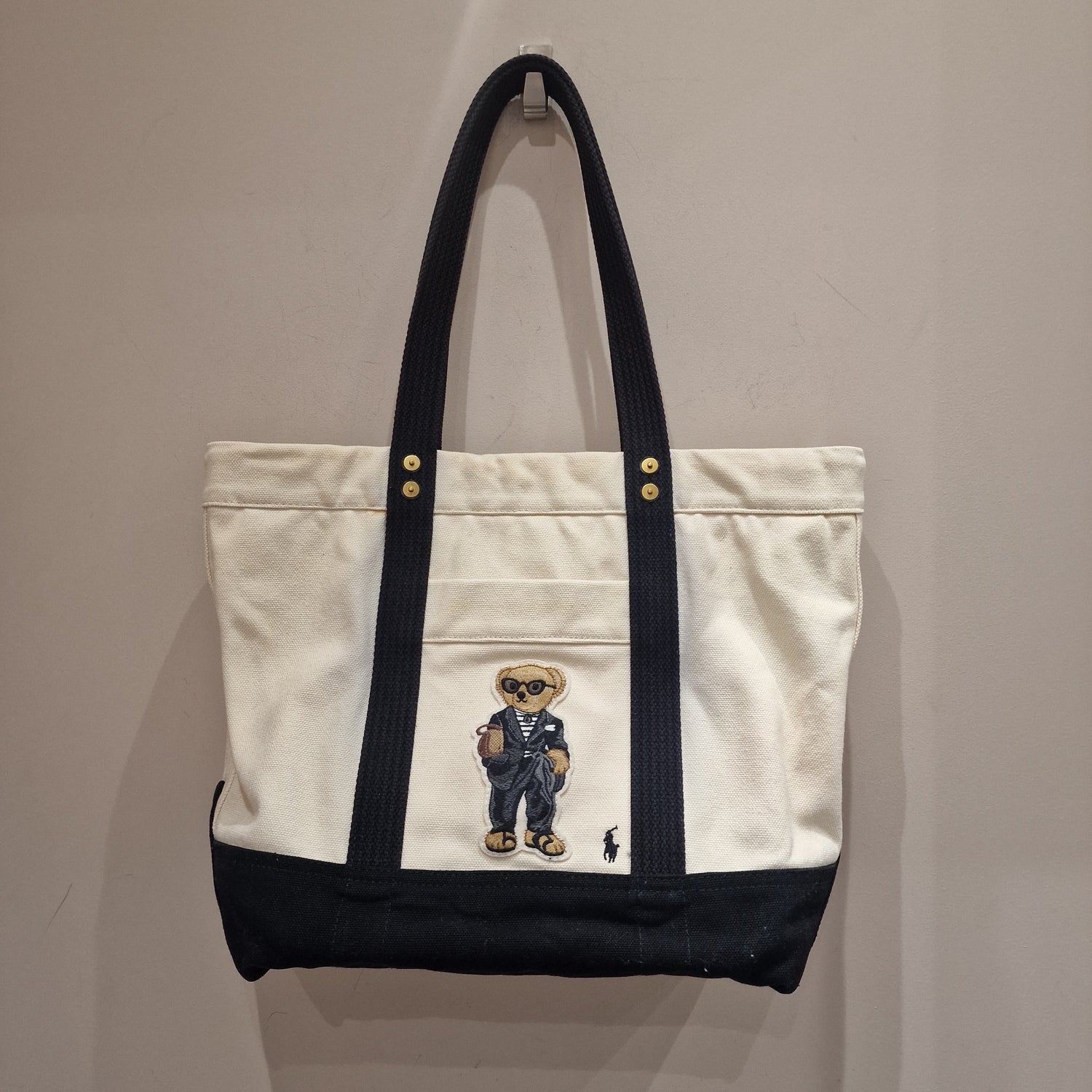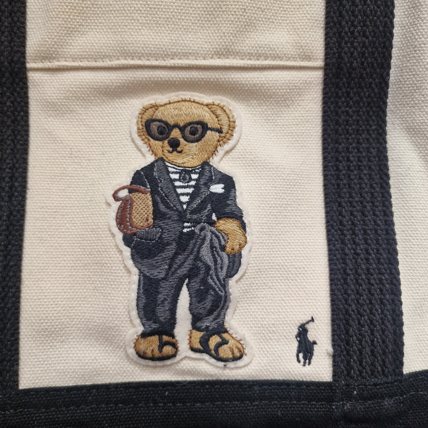 Cream and black canvas tote with iconic Ralph Lauren Bear