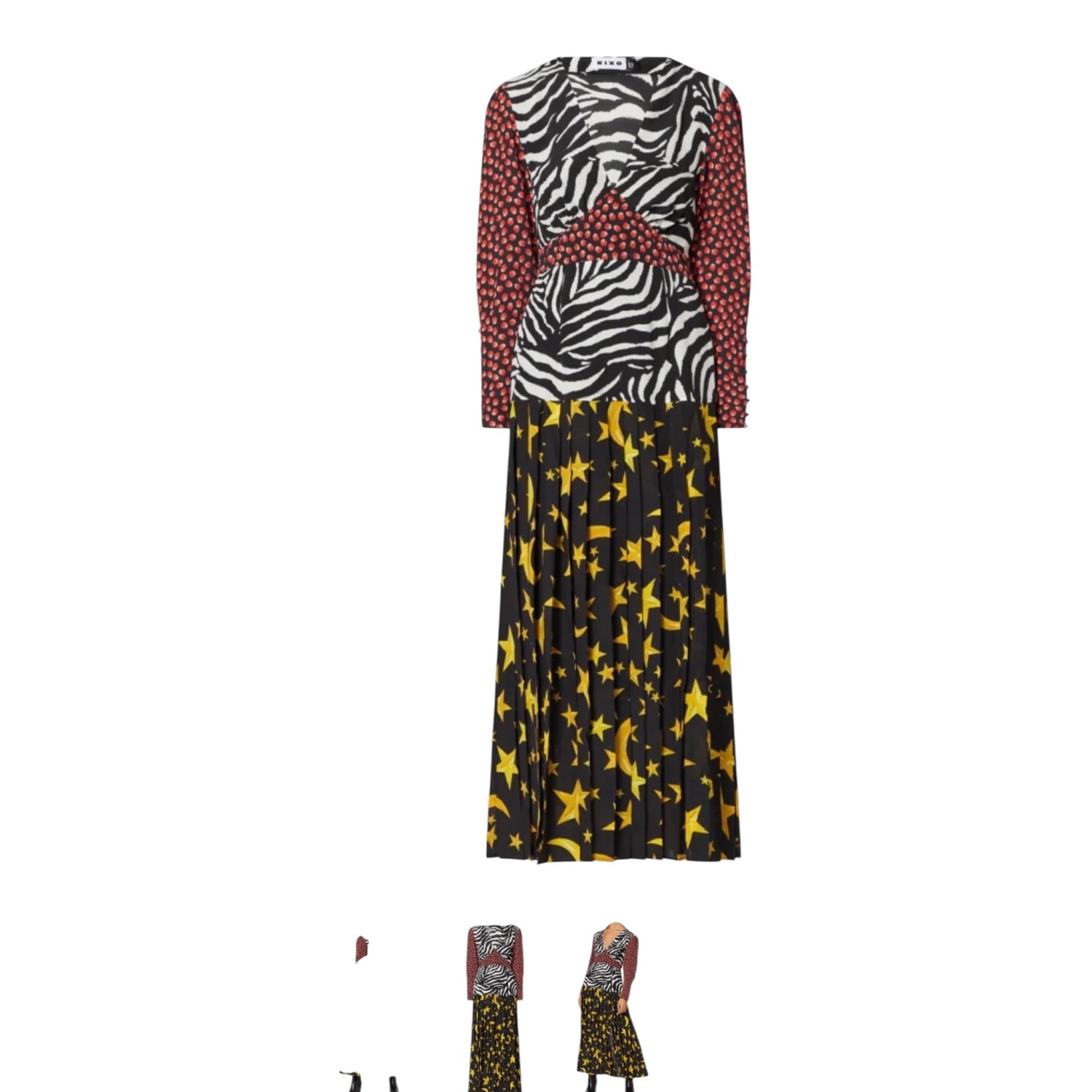 Make a bold sartorial statement when you wear Rixo London's Thea Dress. Styled with a V-neck and pleated skirt, this piece pops with a medley of zebra, dot and star and moon prints on silk. Wear it with stilettos or pair with tennis sneakers to reflect contemporary casual trends.