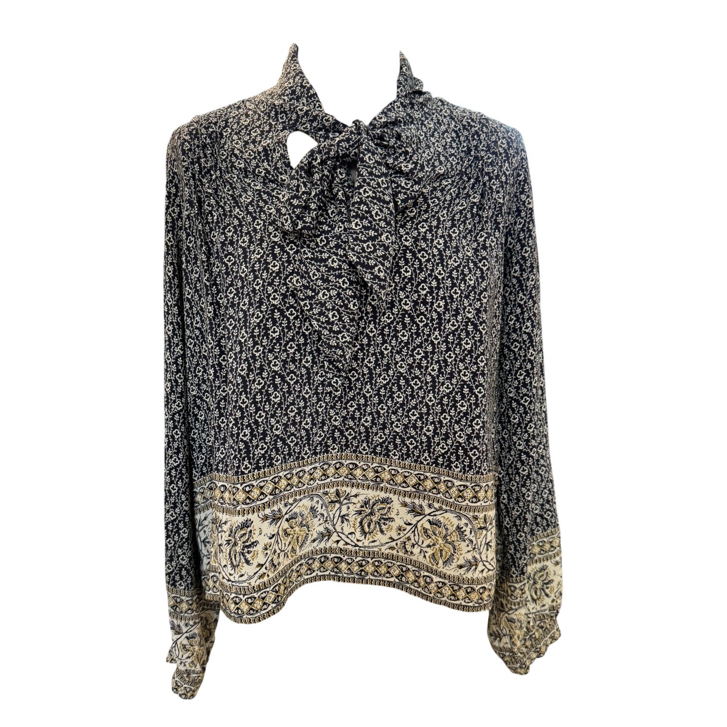 Sea Navy Patterned 100% Silk Tie Neck Top
