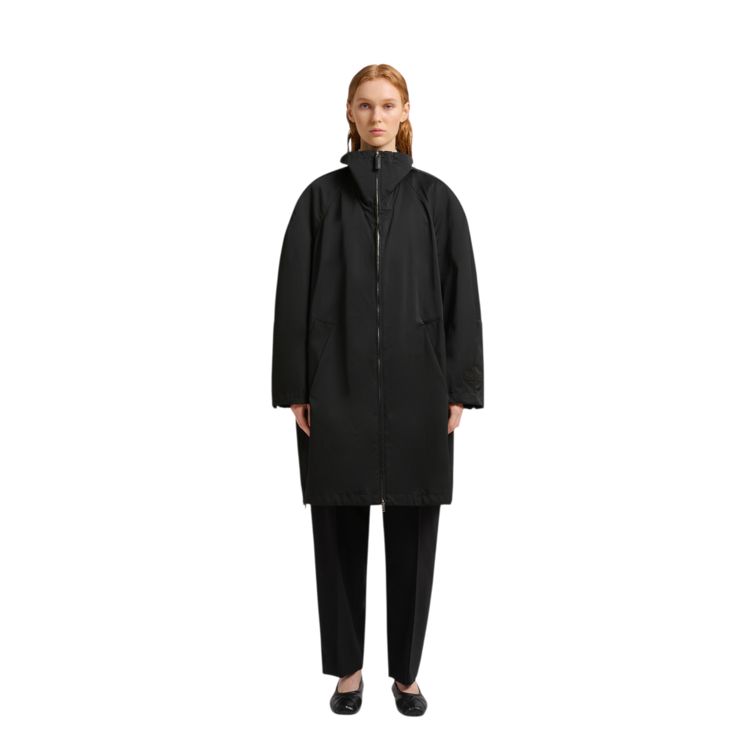 Mid-cut parka made from water-repellent taffeta. Cocoon silhouette with stand collar, rear gathering and drawstring hem. Finished with a concealed two-way zip closure and welt pockets. Finished with a debossed logo patch on the sleeve. Made in Italy